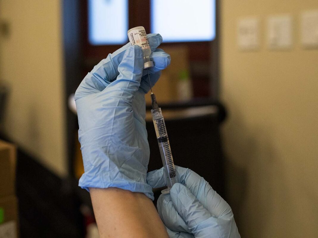 A nurse prepares the Pfizer-BioNTech vaccine during a Confederated Salish and Kootenai tribal vaccination clinic at the KwaTaqNuk Resort in Polson, Montana, on March 30, 2021. (Tailyr Irvine for KHN).