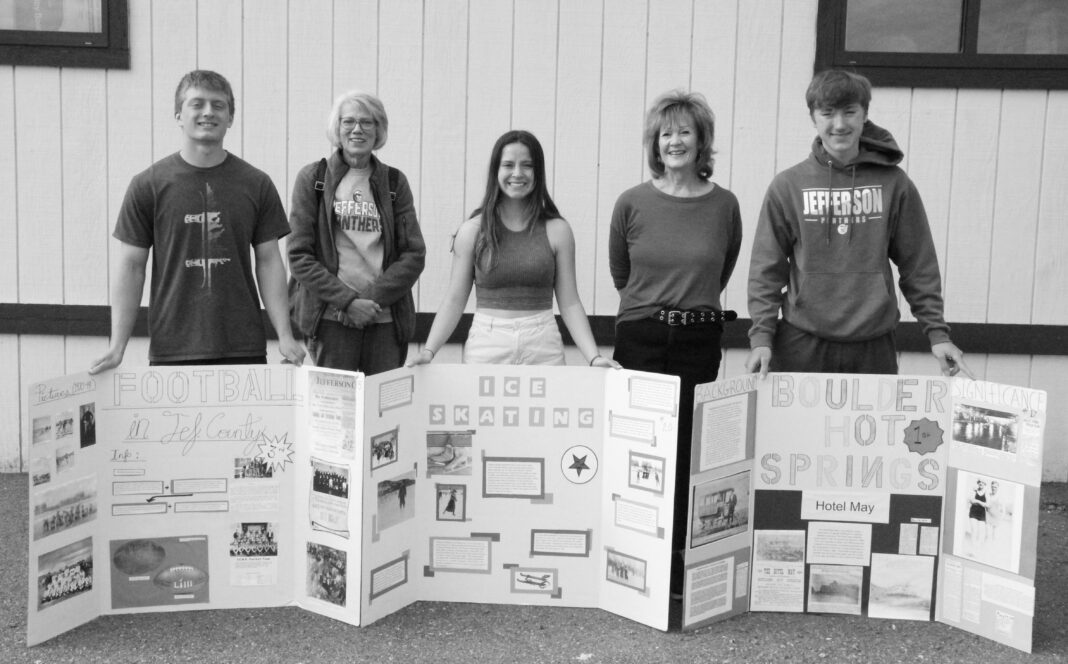 From left to right: Peyton Coates, Nancy Scusa, Emma Popp, Cheryl Vukasin and Colin Field pose with the community’s top three selections for the museum’s annual poster contest outside of Jefferson High School on May 22. Field and his poster detailing the history of the Boulder Hot Springs received first place and a $100 prize. Popp’s ice skating poster took second place for a $75 award, and Peyton Coates poster on the history of football in Jefferson County received a $50 award for third place.