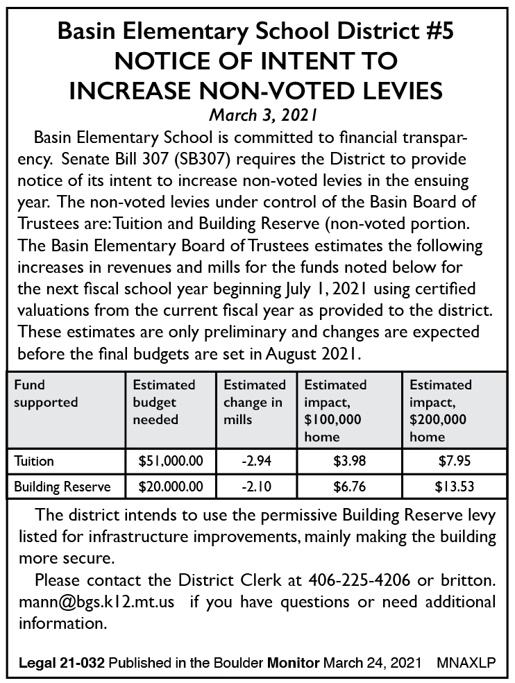 Notices NOTICE OF INTENT TO INCREASE NON-VOTED LEVIES: Basin School March 28, 2021 0 6 Share FacebookTwitterPinterestWhatsApp Levy 5Levy 5. RELATED SOLICITATION FOR PRICE QUOTES ON HERBICIDES February 23, 2026 City of Boulder: INVITATION TO BID February 17, 2026 NOTICE OF SHERIFF’S SALE February 4, 2026 Declarations for Nomination February 4, 2026 Share FacebookTwitterPinterestWhatsApp Previous articleNOTICE OF INTENT TO INCREASE NON-VOTED LEVIES: Boulder Elementary SchoolNext articleWhitehall gets funding for Star Theatre - Advertisement - - Advertisement - LATEST NEWS Dean Grenz, 80, of Boulder March 29, 2026 Jeffrey Bate, 64, ranch hand March 25, 2026 Don’t let corporations control our politics March 25, 2026 At town hall, Downing opines on data centers, lands March 25, 2026 New youth mental health council gathers March 25, 2026