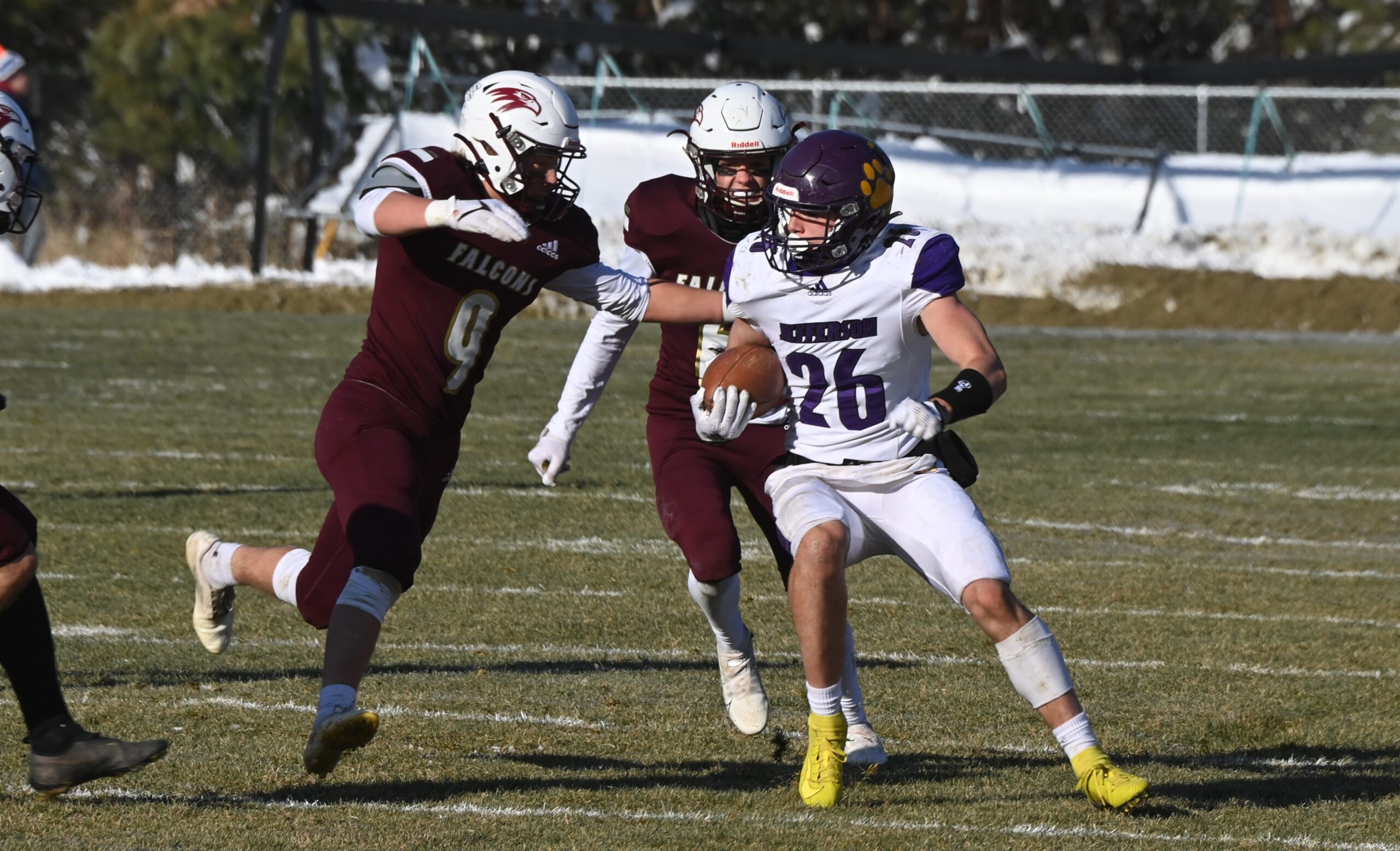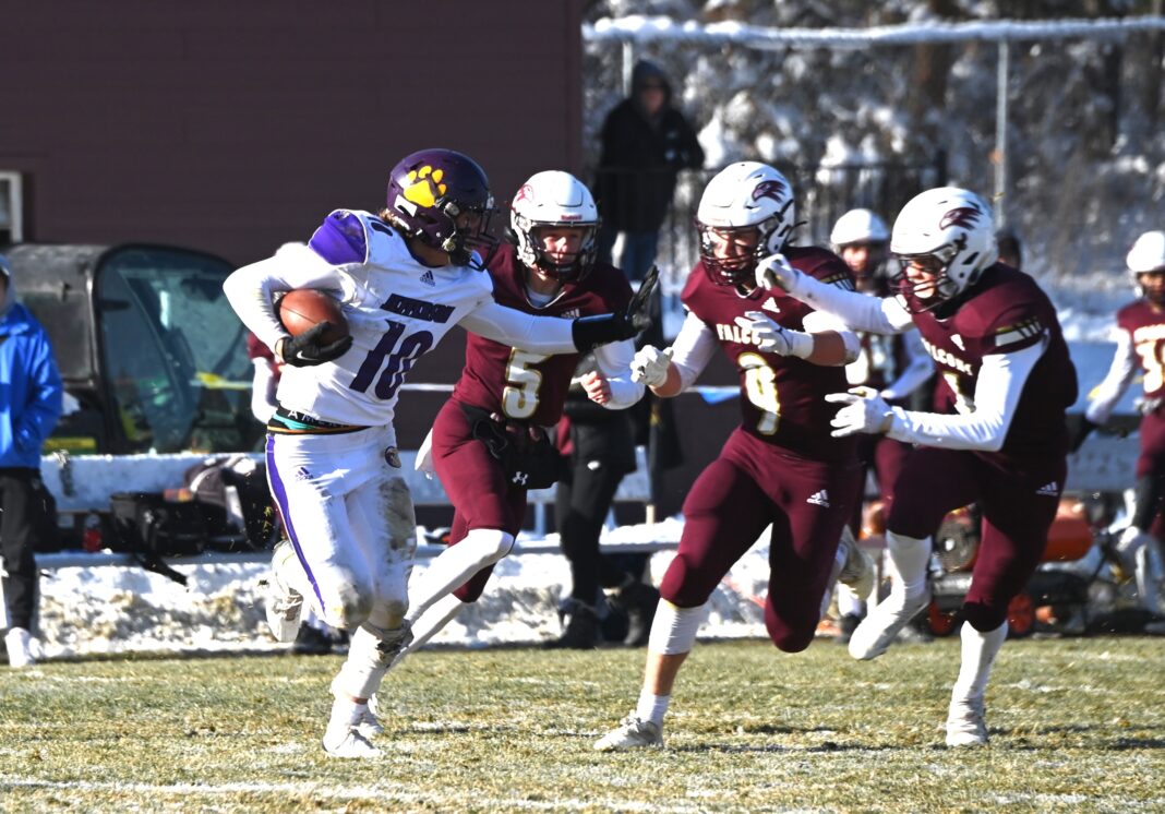 Dylan Root returned the Falcon kickoff to the 39 yard line, but his pass was intercepted. Then, Caleb Smartnick stepped up and returned the favor, intercepting Florence — and Root kicked a 35-yard field goal with 5:33 left in the first to make it 7-3.