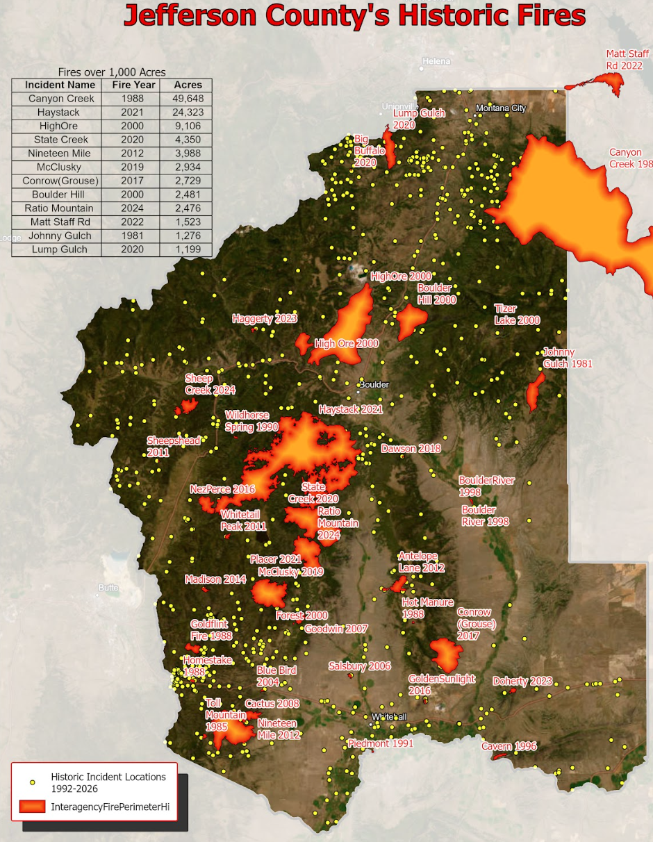 The first round of fire suppression is referred to as initial attack, and when we look at a fire’s perimeters over time, we are really looking at the “ones that got away.” Be it due to fuelscape, topography, or weather conditions, some fires are too dangerous or difficult to catch early. That said, depending on the source, more than 94% of Montana wildfires are extinguished in the initial attack, and Jefferson County is no different.