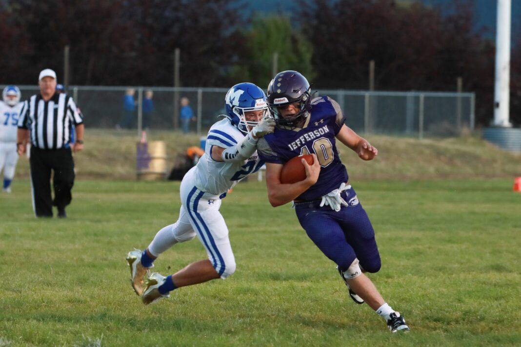So it was that the Jefferson High football squad’s much-anticipated match-up against Malta got delayed by 30 minutes. Fortunately, it was a fast-moving storm: After dropping enough rain to moisten the field, it moved on to the Townsend area, and the teams came back to play on what turned out to be a beautiful evening for high school football.