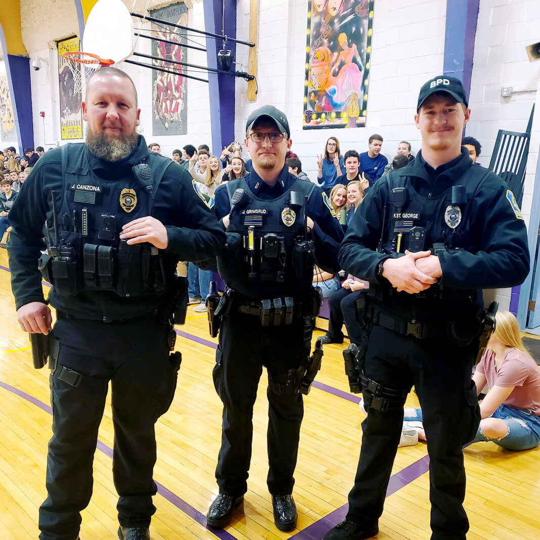 The Boulder Police Department — from left, Chief Joe Canzona and officers Jordan Grimsrud and Kyle St. George — appeared at an assembly held at Jefferson High School Jan. 7. In an agreement between the school and the City of Boulder, the department will provide the school with a student resource officer, or SRO, an hour a day from Monday through Thursday during the school year. The three officers will share the responsibility. The service will cost the school $5,000 a year.