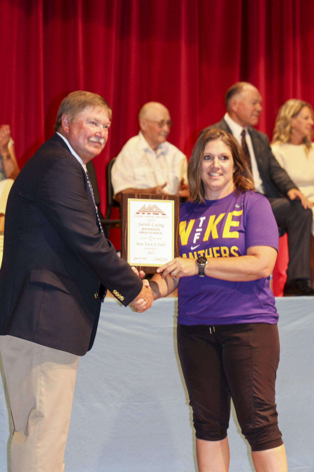 Jefferson High’s Sarah Layng was named Montana’s coach of the year for Class B boys track and field July 29 in front of a big crowd at Charles M. Russell High School in Great Falls for the Montana Coaches Association Clinic.