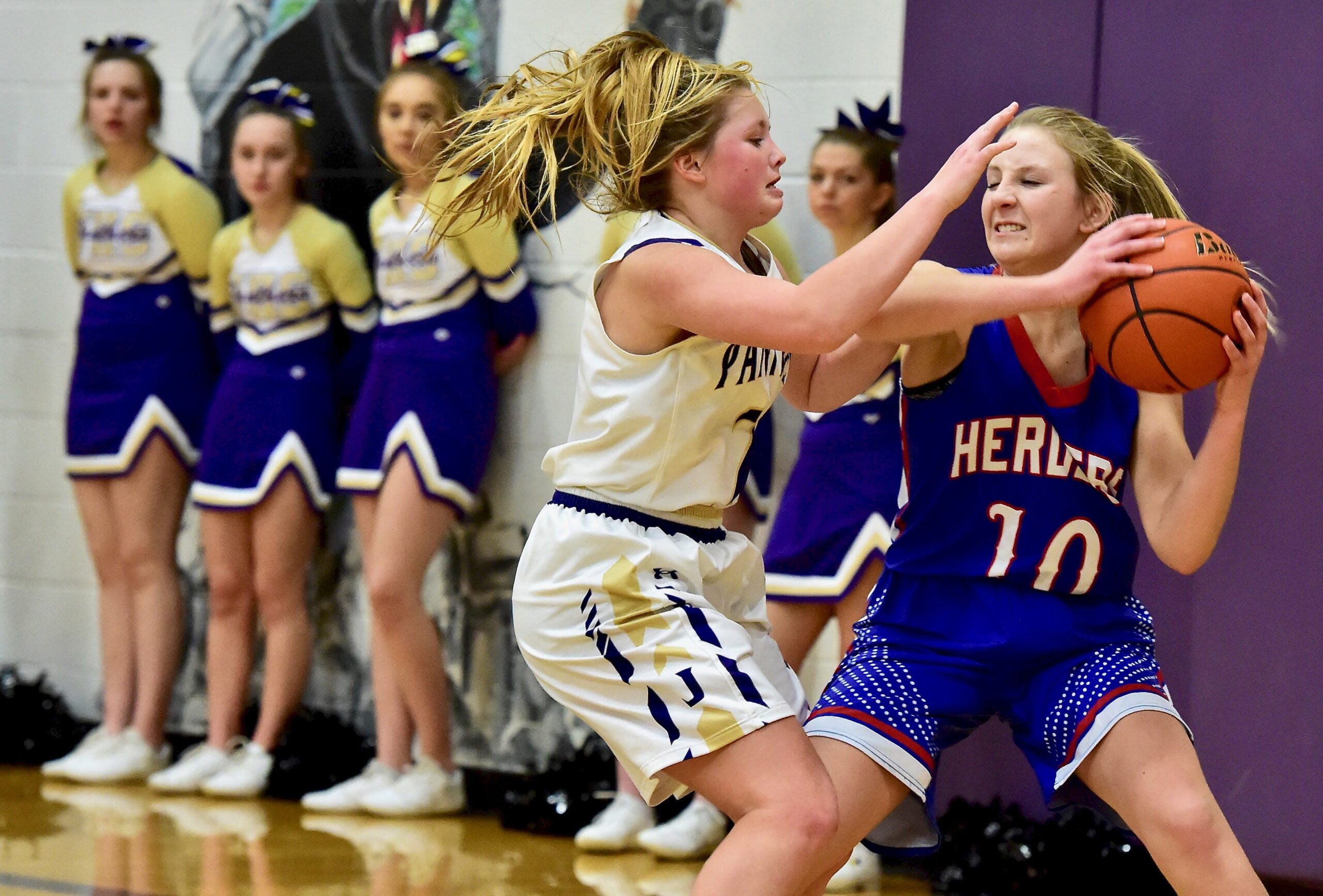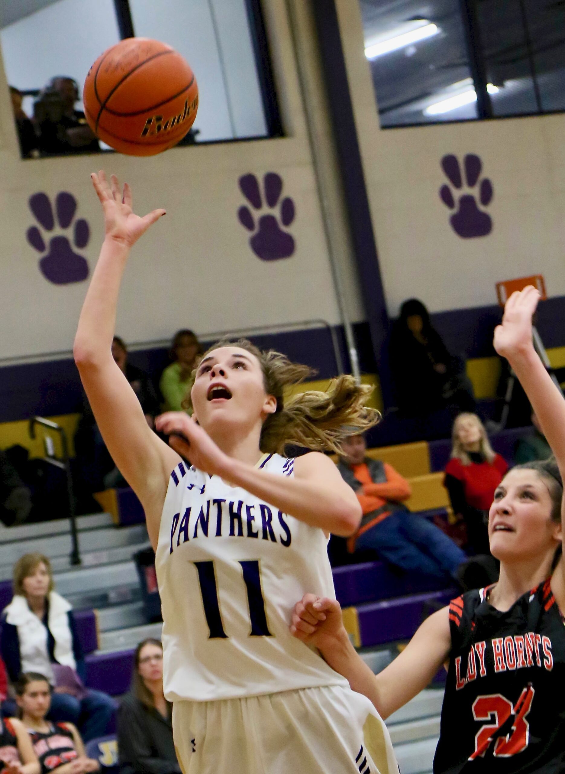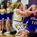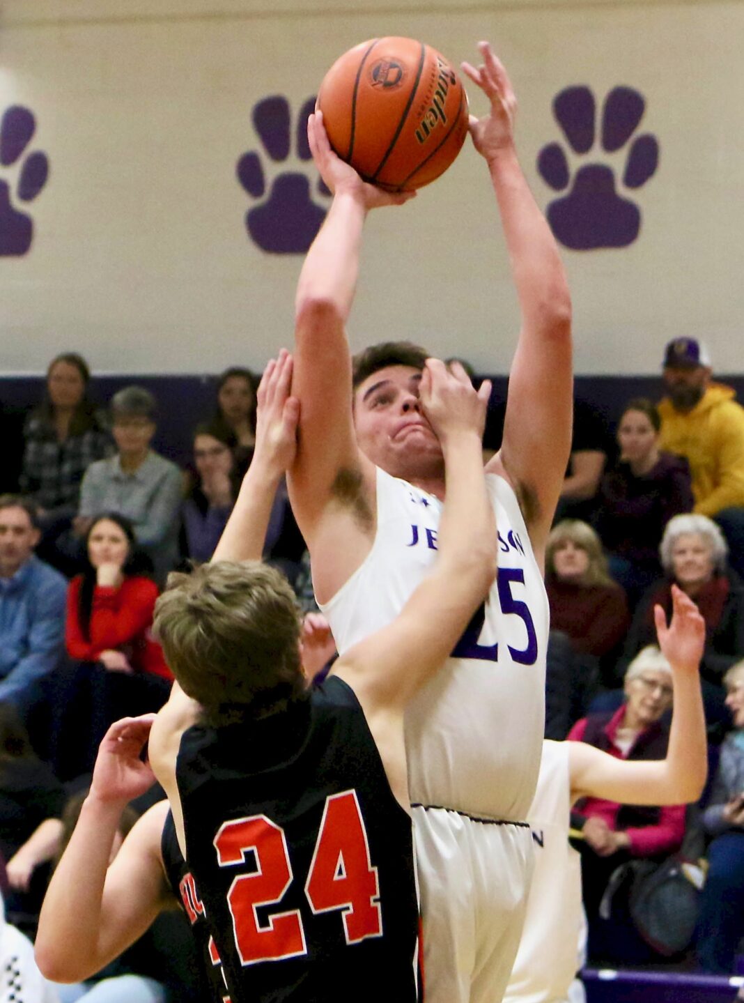 Bryce Harrington of JHS is challenged by Big Timber’s Ethan Bullock on a scoring attempt.