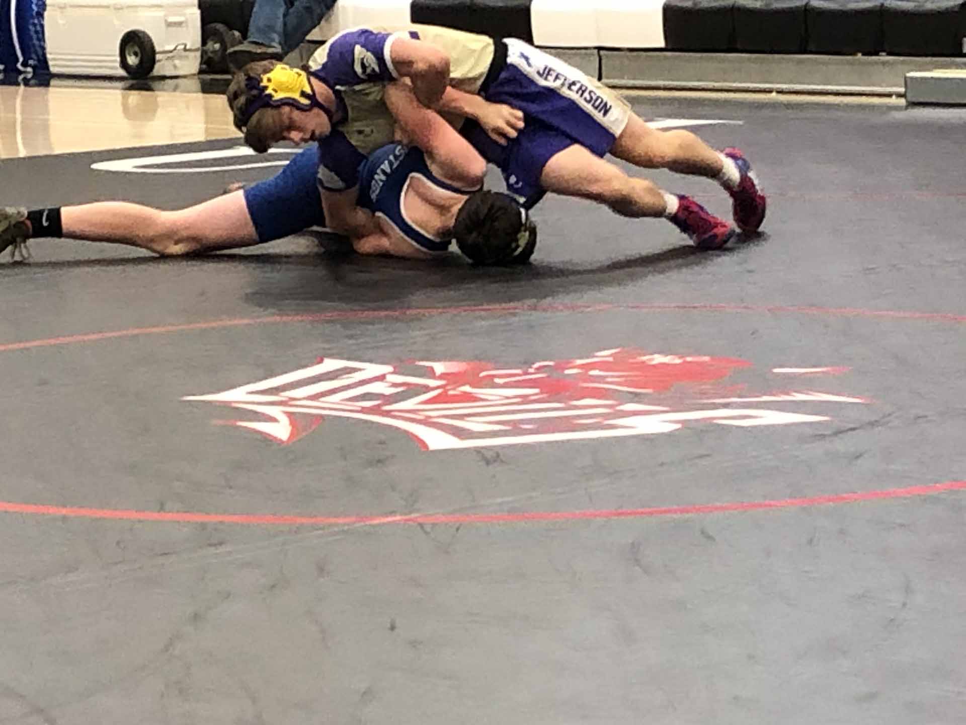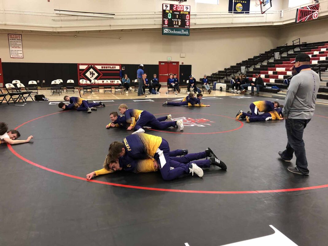 The Jefferson High School wrestling team warms up before taking on Huntley Project on Saturday. (Photo by Troy Humphrey).