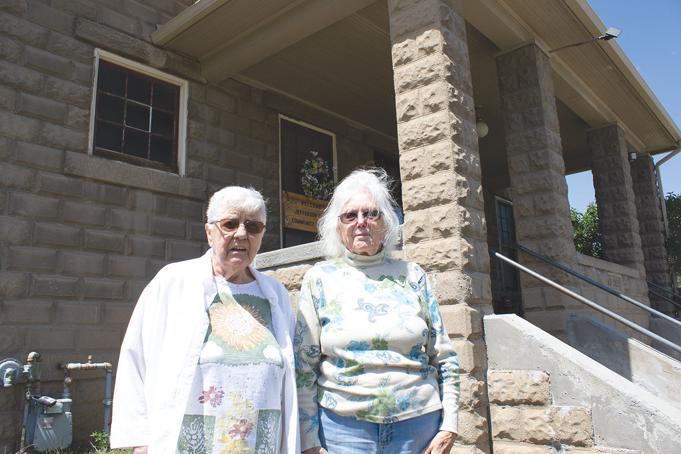 Lois and Marge Reilly in front of their former school, now the Jefferson City Community Center. Typically an active place throughout the year, it’s been largely empty this year due to COVID-19. (Photos by Dante Filpula Ankney).