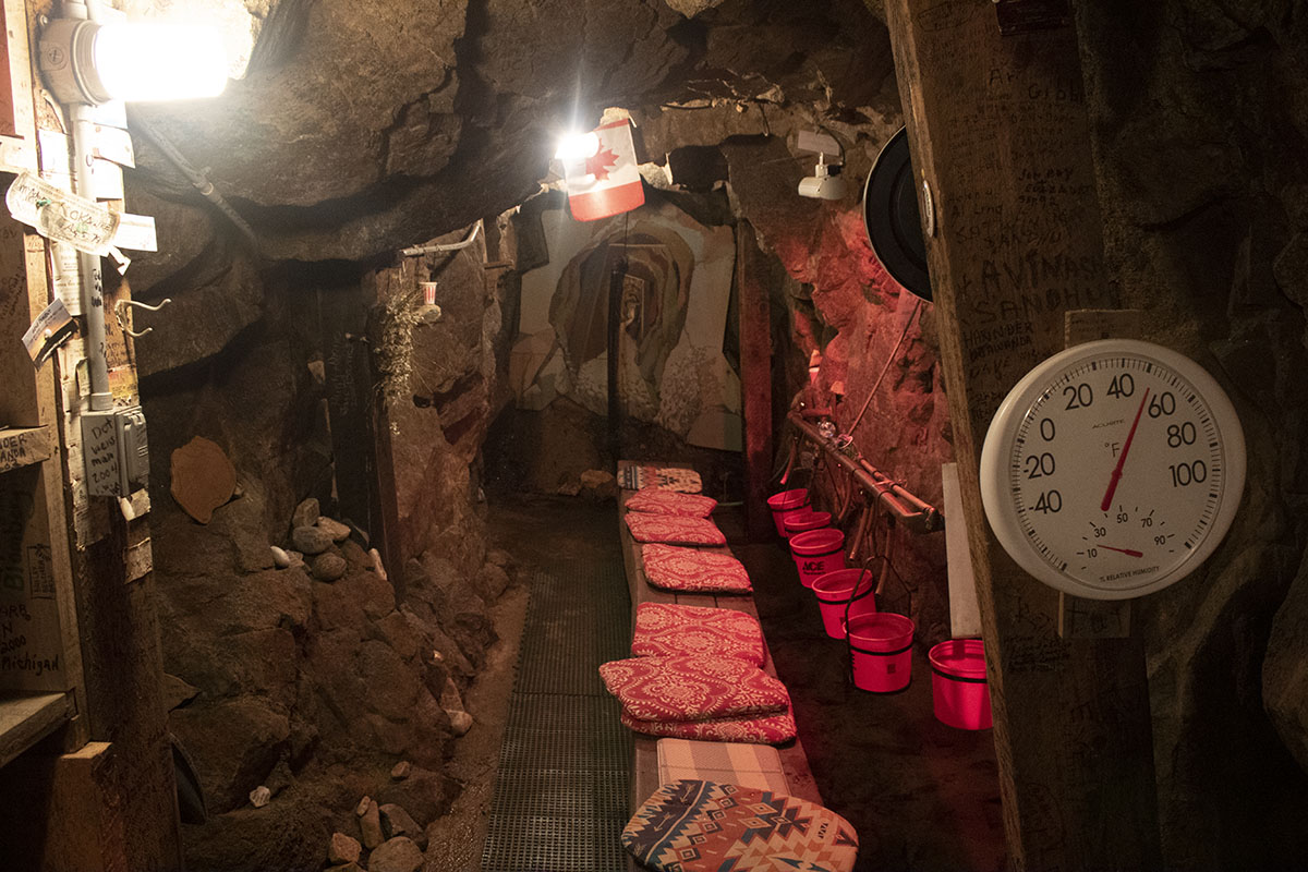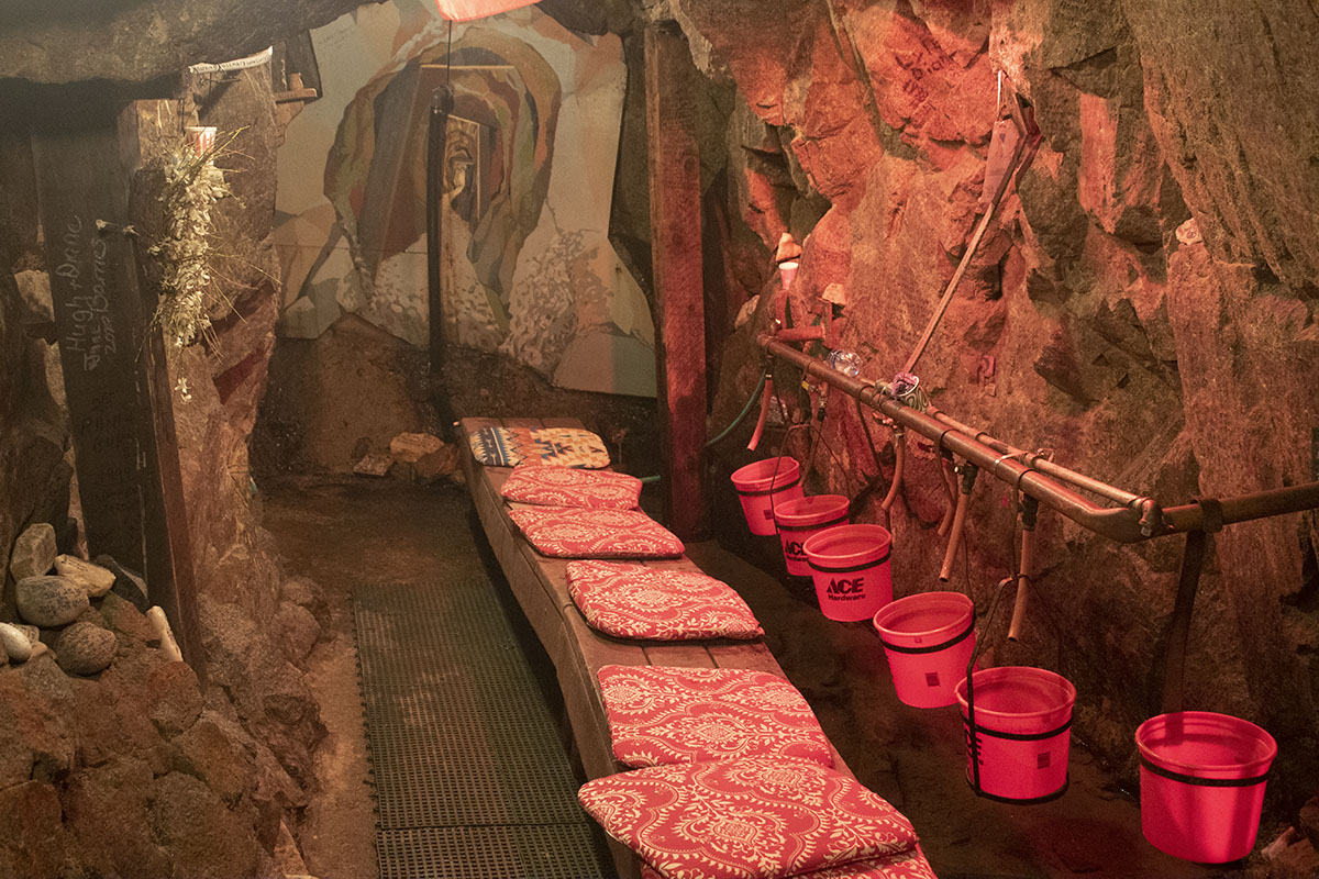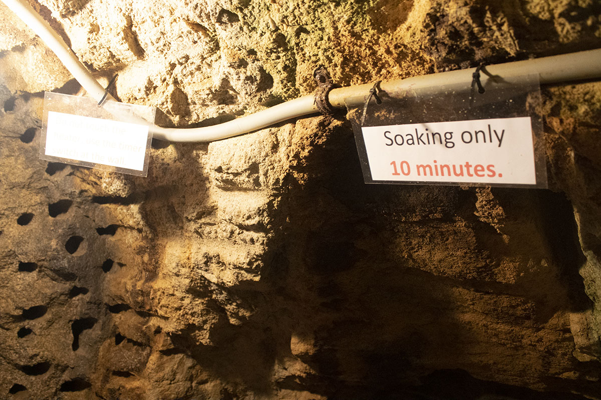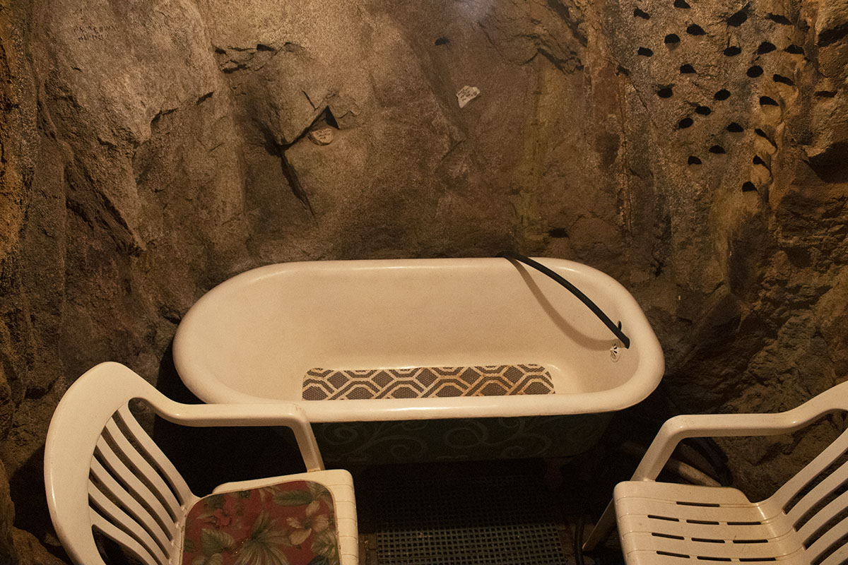 Benches are lined up in the back for people to sit, and temperature gauges hang on the rust-stained tunnel walls. Bathtubs, where visitors are allowed to soak, are hidden around corners and behind curtains.