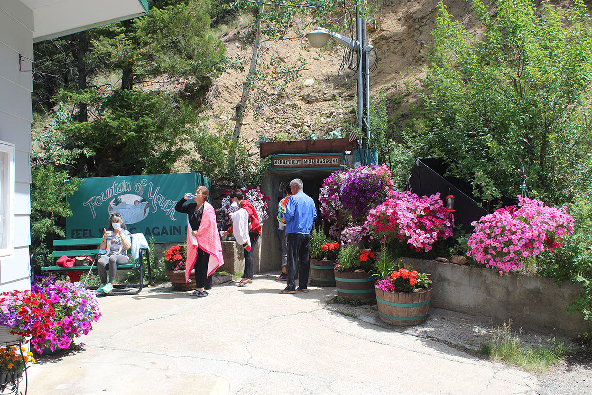 The entrance of the mine sits across from the Boulder River from the RV park and up a gradual gravel incline to the parking lot. A concrete retaining wall, painted green, surrounded by pink, purple and white flowers, with flowing white letters spelling “the fountain of youth” marks the entrance — a heavy wooden door with a metal handle.