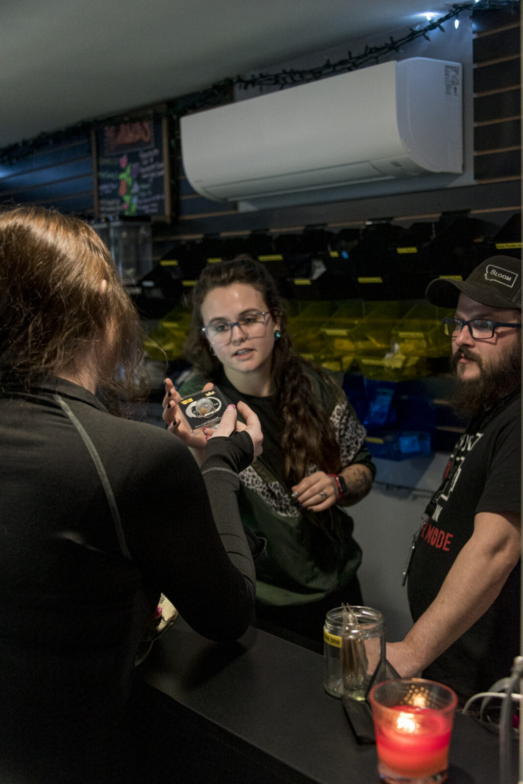 A Boulder resident (left) purchases marijuana products from store manager Kaylee O’Brien (center) and budtender Jeramy Frederick (right) at Bloom Dispensary in Boulder on Monday. Recreational sales of marijuana products in counties and towns across Montana, including in Boulder, began on Jan. 1.