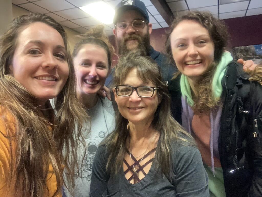 Hipocrats bandmates Sarah Brunner, far left and Tyler McGinnis (back row, center) take a picture with waitress Joy Fleming (center) while dining at the Elkhorn Bistro in February 2022 with friends Andi Scher and Hailey Magee (also pictured). Photo courtesy of Sarah Brunner.