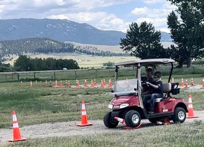 A local youth gets a lesson on the difficulty of driving under the influence while using Drunk Busters Impairment Goggles on the golf cart course at the Safety Road-eo. Health Officer Jim Murphy rides along. (Photo courtesy of Callie Warfle).