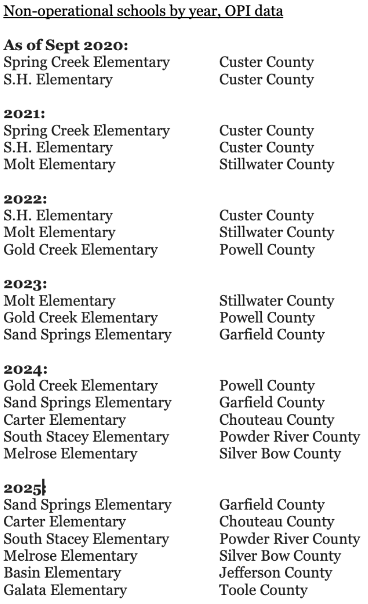 The list of non-operational schools each year since 2020, OPI data.