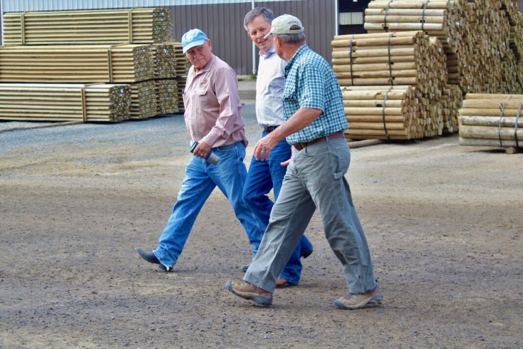 From left, Jefferson County Commissioner Leonard Wortman, Sen. Steve Daines and Gary Marks chat during a tour of Marks Miller Post and Pole on Aug. 7. Daines visited the lumber yard as a part of his tour of Montana while the U.S. Senate is out of session to spread awareness about his forest management reform proposal with Sen. Dianne Feinstein.