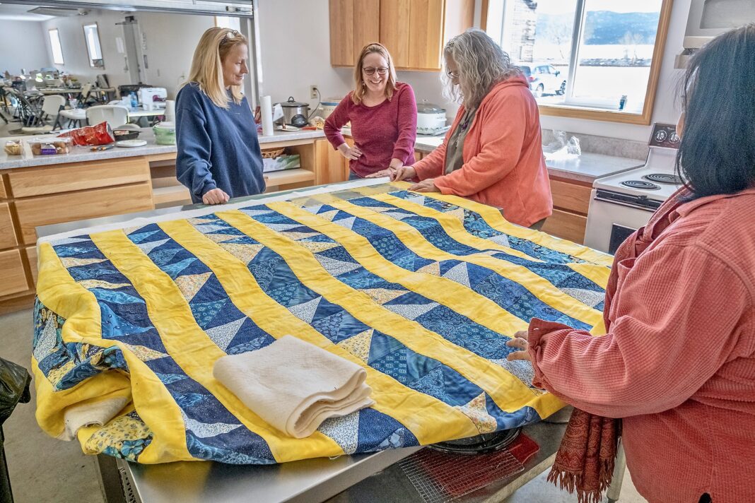 Tammie Chenoweth, center, discusses her quilt with Stacy Cagle, left, Jeanie Thiel and Melanie Sako at a “sew in” at Jefferson County Recreation Park Saturday. She bought the quilt for $1 at a yard sale about 20 years ago and had been meaning to work on it ever since.
