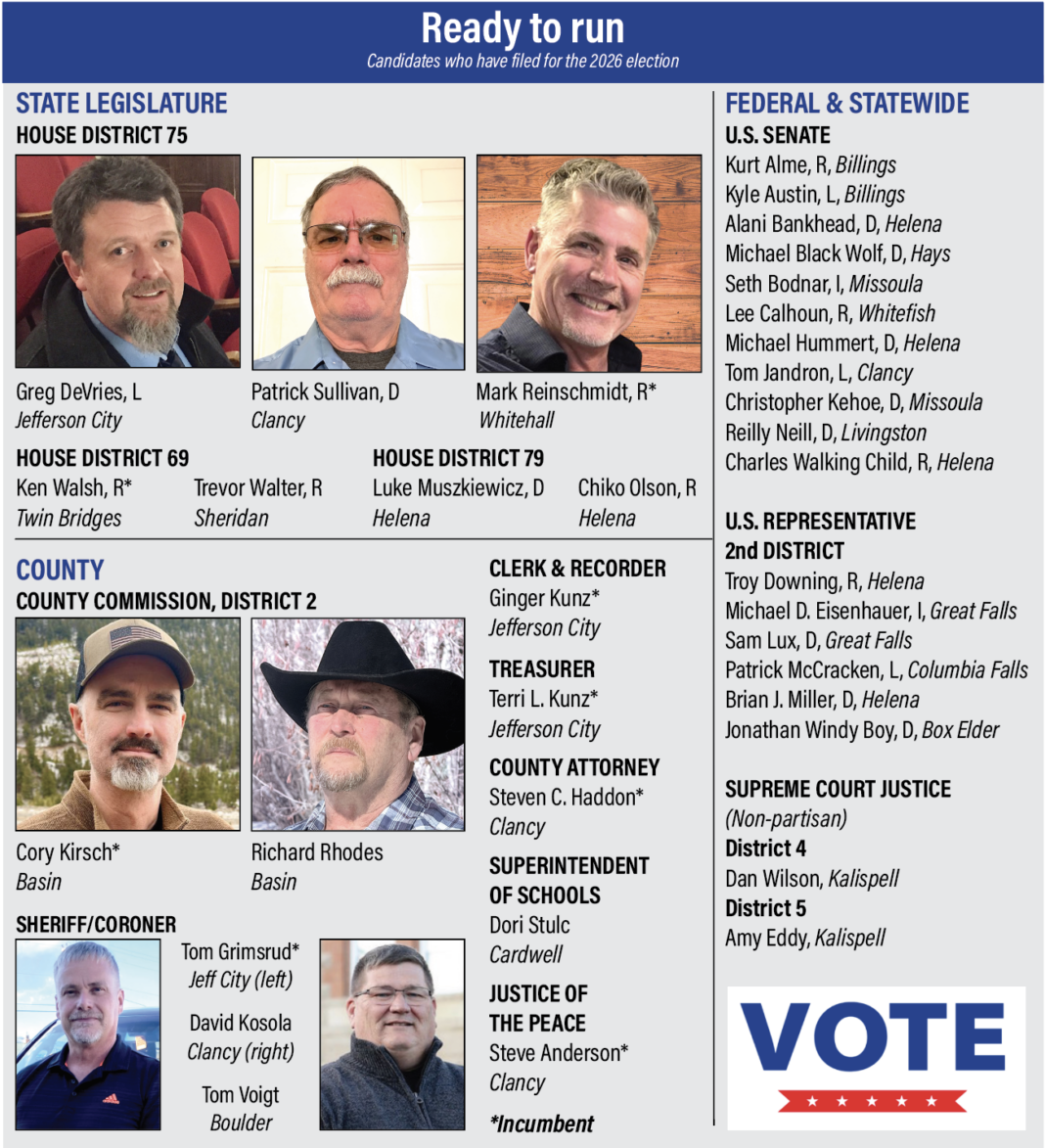 Vying for the Jefferson County Sheriff’s Office are incumbent Tom Grimsrud of Jefferson City, David Kosola of Clancy and Tom Voigt of Boulder. Grimsrud grew up on a ranch in northeastern Montana and served in the Montana Army National Guard before beginning his law enforcement career, according to his campaign Facebook page.