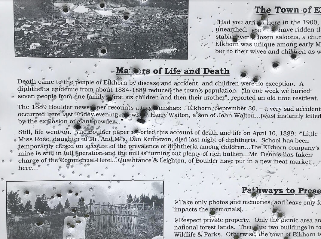 Bruce Bell with the Jefferson County Museum said he counted more than 80 shots fired at the Elkhorn Cemetery sign. (Dante Filpula Ankney/Boulder Monitor).