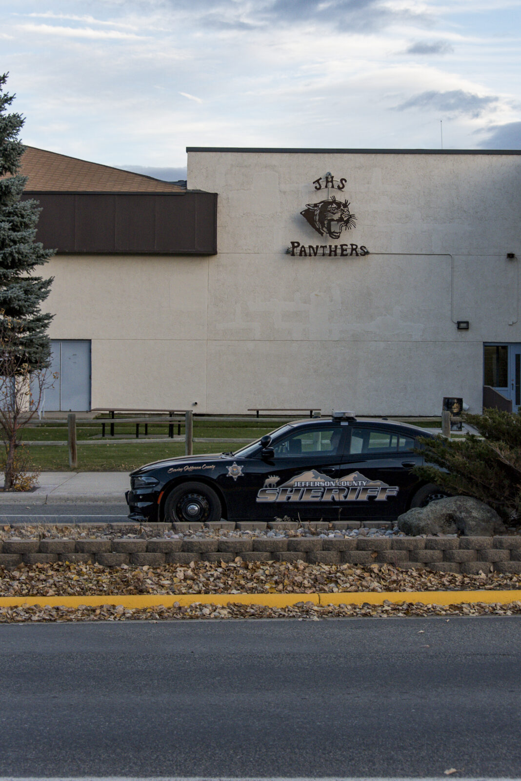 A Jefferson County Sheriff's Office vehicle drives past Jefferson High School in Boulder around sunset on Oct. 28.