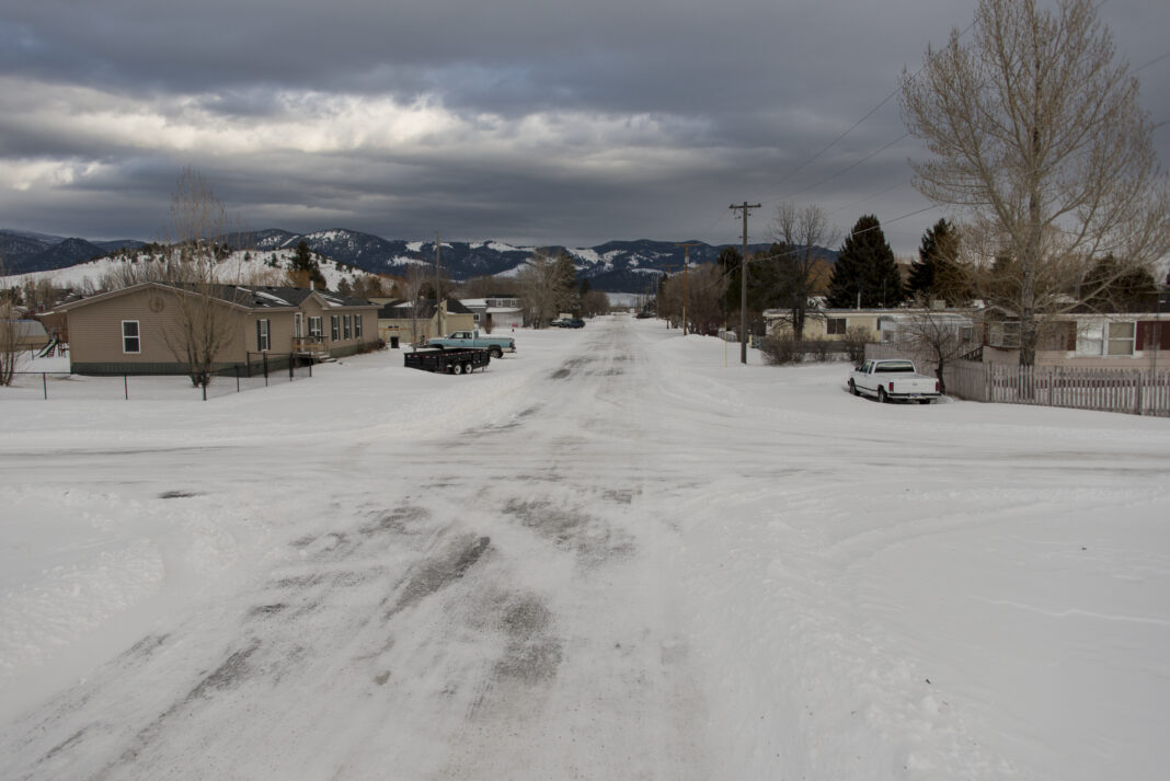 The uncontrolled four-way intersection of West First Avenue and North Jackson Street in Boulder is seen here covered in snow on Feb. 3, 2022.