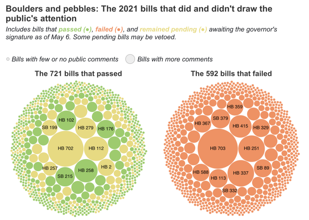A tally of public comments produced by legislative staff, reflecting web and phone messages sent to lawmakers through the Legislature’s information services desk, indicates there were more than 127,000 individual comments on the 1,313 bills that were considered over the course of the 2021 session. The lion’s share of those comments, two-thirds, dealt with only 50 high-profile measures.