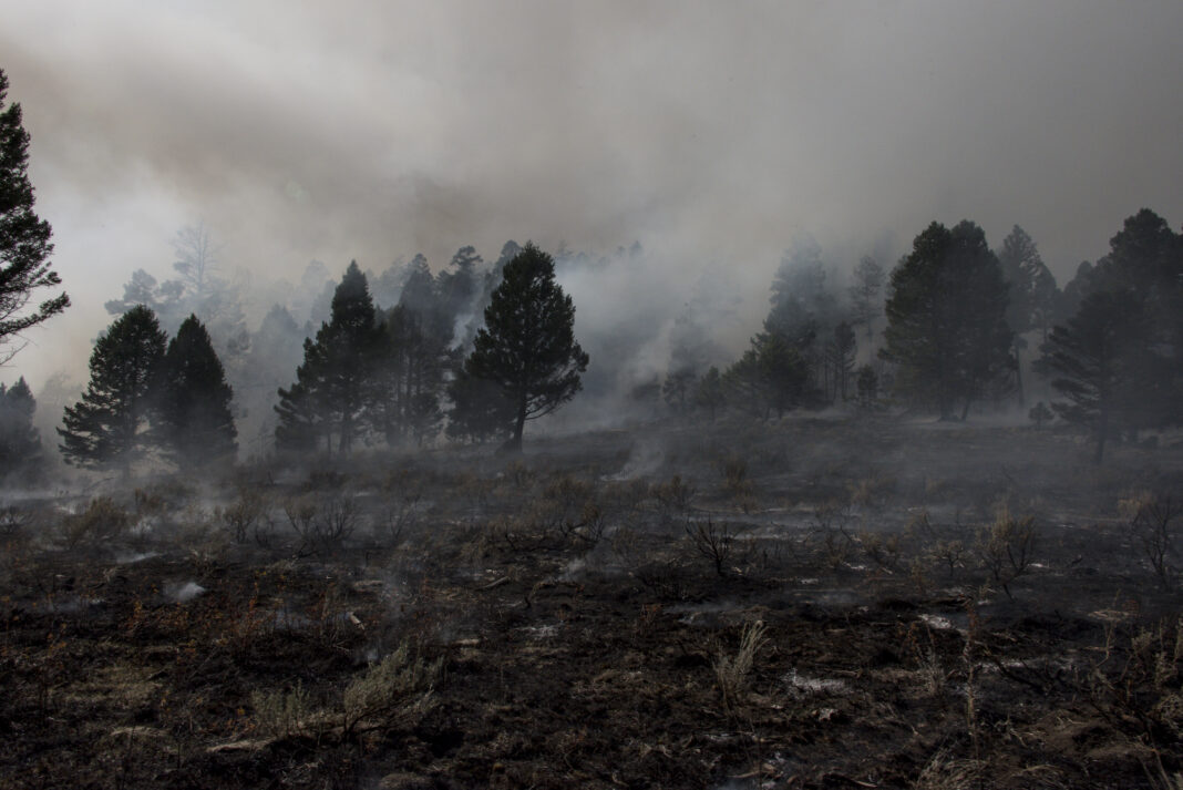 Charred land, with trees and some brush remaining alive, smolders along a containment line on the northeast side of the Haystack Fire south of Boulder on Sept. 30.