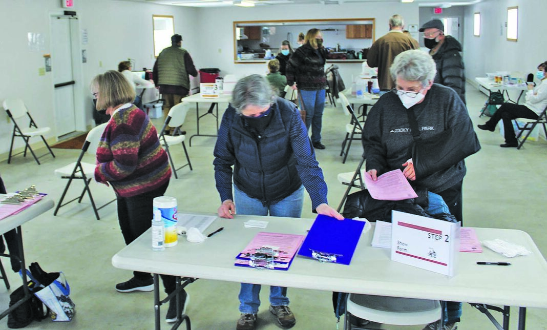 Volunteers prepare for a mass vaccination clinic held by the Jefferson County Public Health Department in February at Volunteer Hall at the fairgrounds. As of April 12, there have been 1,668 Jefferson County residents vaccinated, with 1,097 having received a first dose and 571 fully vaccinated. Also on Monday, the Public Health Department reported eight active cases of the virus. (Diana McFarland/Boulder Monitor).
