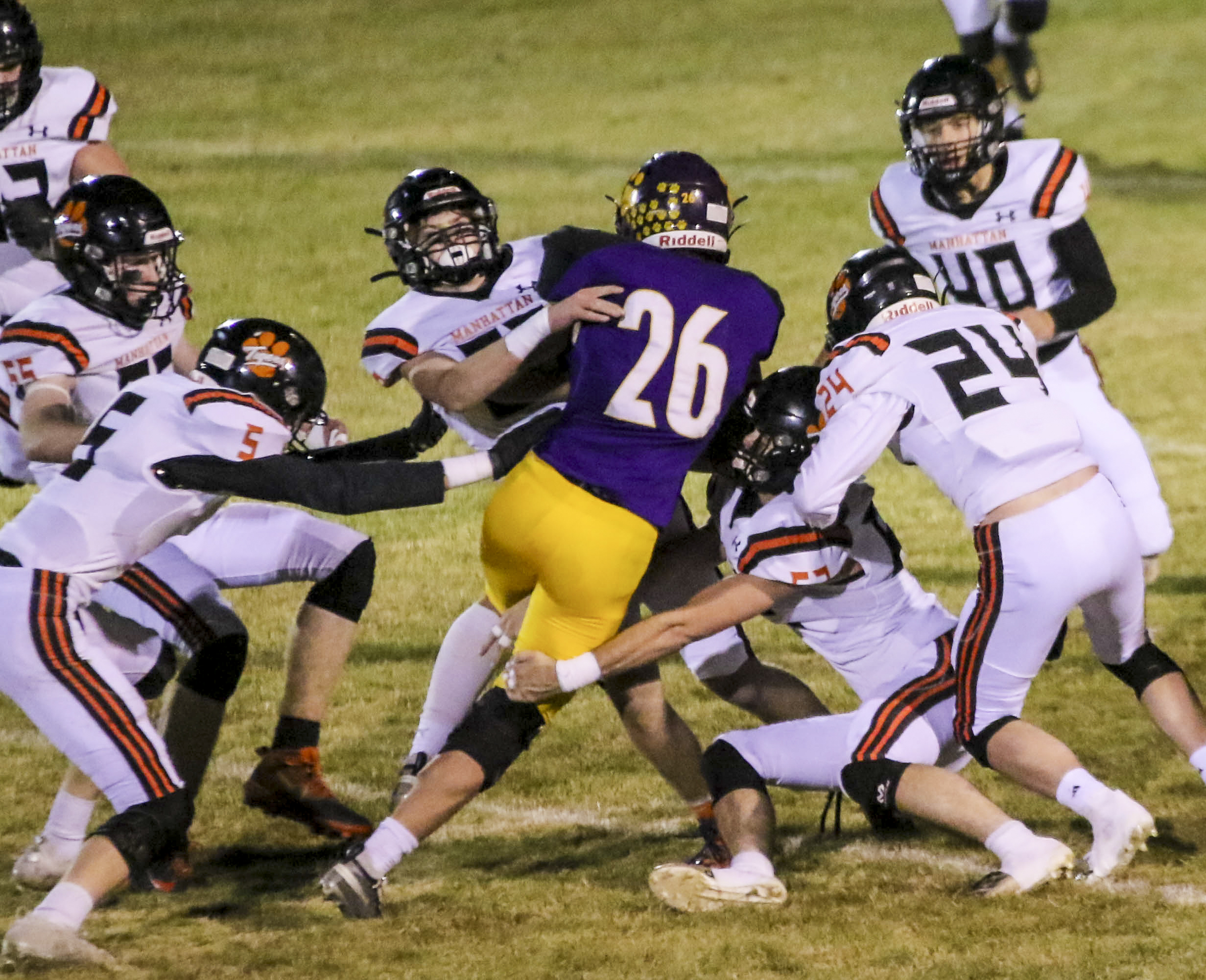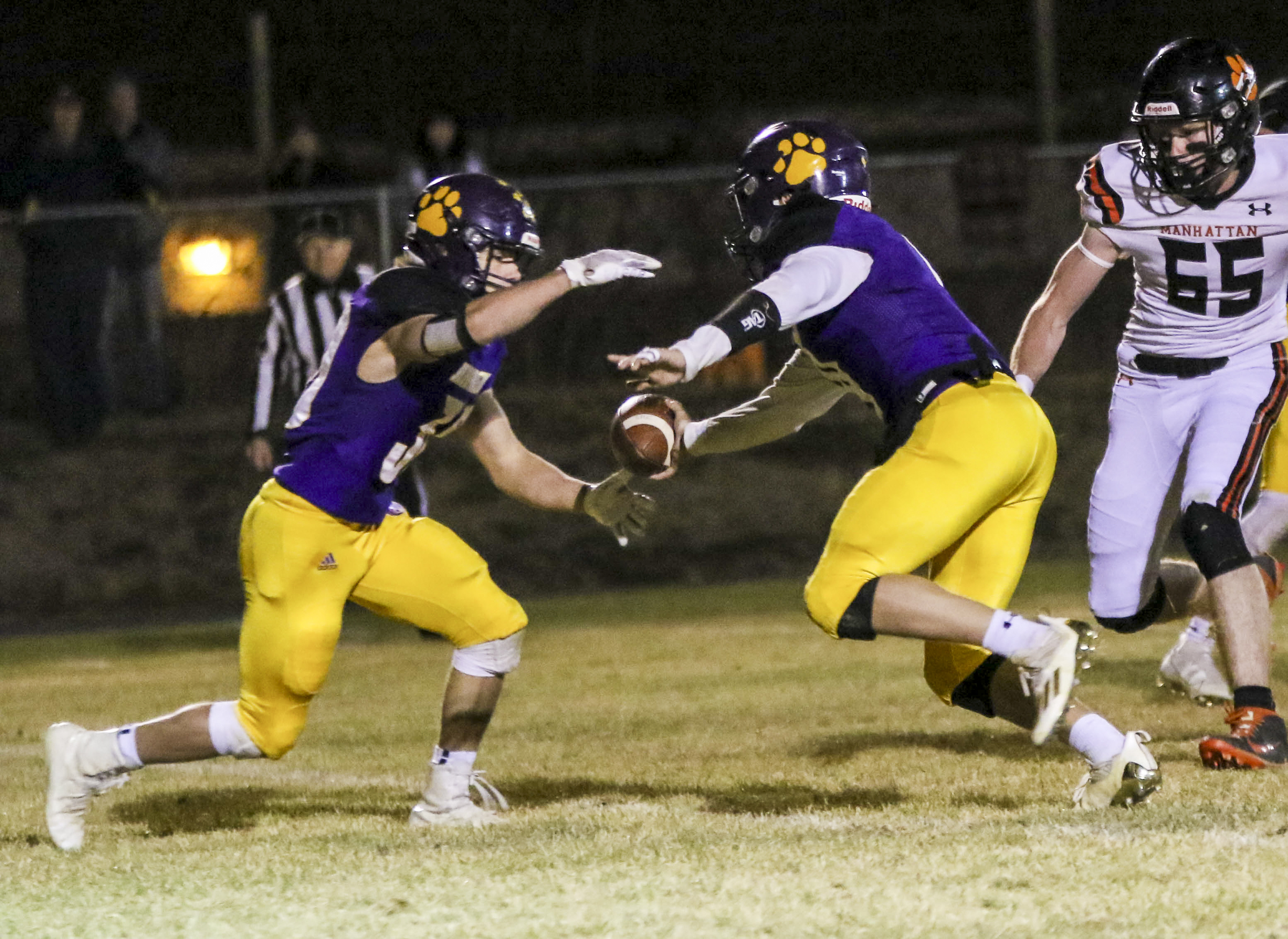 Manhattan’s punt after the safety went out of bounds on the Panther 47. Quarterback Braden Morris ran to the 32, Root drove to the 24, and a pass from Morris to Root took it to the 7. From there, it was Morris on keeper for a touchdown. Root’s extra-point kick made it 9-0 with 4:53 left in the first.
