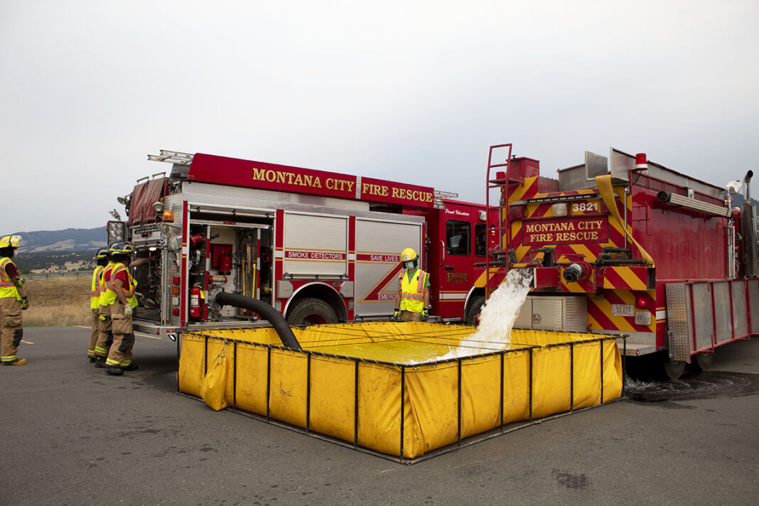 Two of the Montana City Volunteer Fire Department newest firefighters recently observed pump operations conducted by trained and experienced MCVFD firefighters during Static Water Supply training at MCVFD Station 1. Jacob Quinn, (far left) studies the finer points of operating the fire engine pump, while Luke Ferguson (right at tank) watches the water level climb in the portable water tank in order to signal the water tender operator (out of sight) when to stop filling. The dark hose going into the portable tank is sucking water into the fire engine tank for another firefighter (not shown) to release through a 2 1/2” hose nozzle. Fire department training tests the equipment and procedures used so members are prepared to efficiently and safely fight fires. The initial portion of the evening’s training —  dropping the tank, getting the draft hose off the truck and  into the tank and pumping water is just one of many timed tests to be conducted by the Insurance Safety Organization (ISO) when agents visit in late September. Many insurance companies use ISO ratings when determining home insurance rates. In 2016 the Montana City ISO rating fell from a Split Class 7/9 to Class 5, resulting in lower premiums for many homeowners. Not all insurance companies use ISO ratings when determining their rates. (Bridget Weigel/Boulder Monitor)