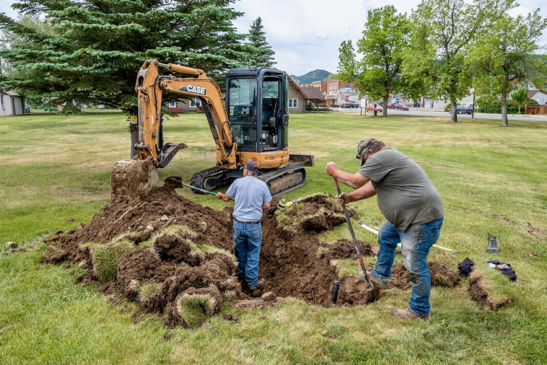 City of Boulder employee Scott Warren, left, and contractor Rick Zitnik fix the sprinkler system at Veterans Park on June 26.