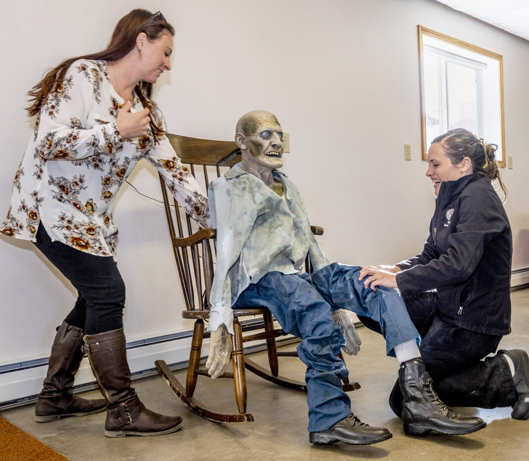 Ginger Kunz, left, and Kayla Holman test an animatronic ghoul Sept. 25. Kunz and Holman are on the committee in charge of this year’s four-day Halloween celebration at Jefferson County Fairgrounds in Boulder.
