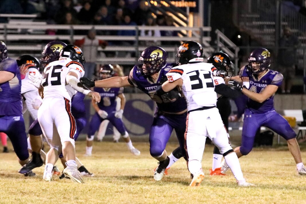 Jefferson High lineman Dalton Noble in action against Manhattan on Oct. 13. Noble will join the U.S. Military Academy football program next year.